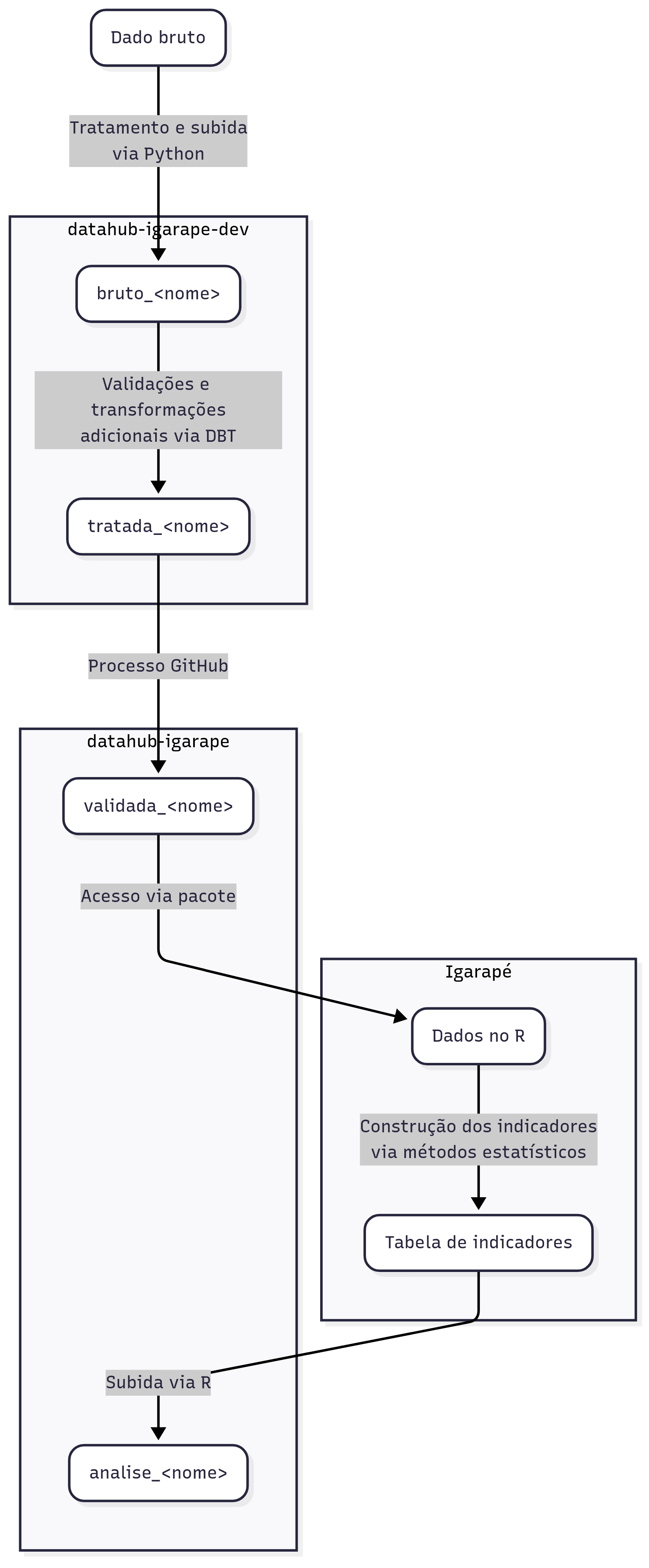 Como vimos na seção visão geral da infraestrutura, o processo de dados ocorre em 3 etapas principais: ingestão, transformação e disponibilização de dados para aplicações. Com base nestas categorias, explicaremos o passo a passo do processo desenhado para o DataHub do Instituto Igarapé.