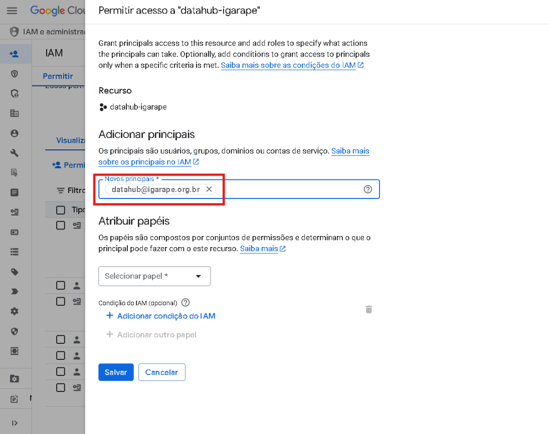 Por exemplo, vamos atribuir os papéis de egenheiro de dados para o projeto de produção para o usuário datahub@igarape.org.br: