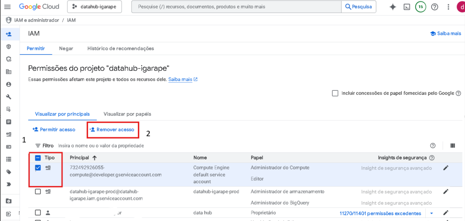 O processo de remoção de acesso é feito no mesmo painel do IAM que utilizamos para conceder acesso na seção anterior. Esta operação é feita tanto a nível de emails institucionas que representam usuários humanos quanto para contas de serviço que possuem os papéis customizados definidos.
